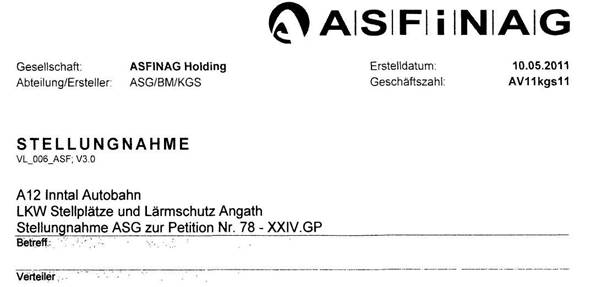 A12 / Lärmschutz Angath Nord (Fürth): Im Jahr 2003/2004 wurde auf Basis der seit damals unveränderten Grenzwerte eine Lärm- schutzmaßnahme in Bereich Angath - Fürth umgesetzt (entsprechend der damals gültigen Dienstanweisung für Lärmschutz an Bundesstraßen aus dem Jahre 1999). Darüberhinaus wurde aufgrund der im Siedlungsbereich immer noch festgestellten Grenz- wertüberschreitungen von schutzwürdigen Wohngebäuden entsprechend den Kriterien der Dienstanweisung für Lärmschutz an Bundesstraßen aus dem Jahre 2006 geprüft, ob noch zusätzliche Lärmschutzmaßnahmen möglich sind. Das Ergebnis dieser Prüfung war, dass von der ASFINAG keine zusätzlichen Lärmschutzwände errichtet werden können, jedoch die Möglichkeit besteht, dass für die betroffenen Gebäude um passive Lärmschutzmaßnahmen angesucht werden kann. Entsprechend den aktuellen Planungen für den Umbau der Raststation Angath-Nord, dem geplanten Ausbau der Unterinntaltrasse und der zusätzlichen Lkw-Parkplätze im Bereich An- gath-Süd liegt ein mögliches Gesamtkonzept zur Verbesserung der Situation im Bereich An- gath-Fürth vor, welches bei einer Umsetzung aller drei beteiligten Projektwerber (ÖBB, OMV, ASFINAG) schlagend werden würde. Entsprechend diesen Überlegungen könnte unter der Einhaltung der Bestimmung der Dienstanweisung Lärmschutz 2006 der östliche Siedlungs- räum von Angath Fürth zur Gänze zumindest auf den Grenzwert geschützt werden. Für nicht schutzwürdige Gebäude im Sinne der Dienstanweisung (z.B. Baugenehmigung nach dem Stichtag 1.1.1996) besteht für die ASFINAG keine Möglichkeit, aktive oder passive Lärmschutzmaßnahmen umzusetzen bzw. zu fördern. |