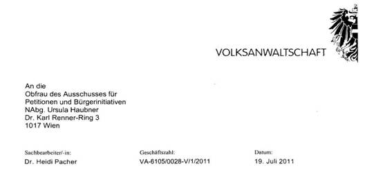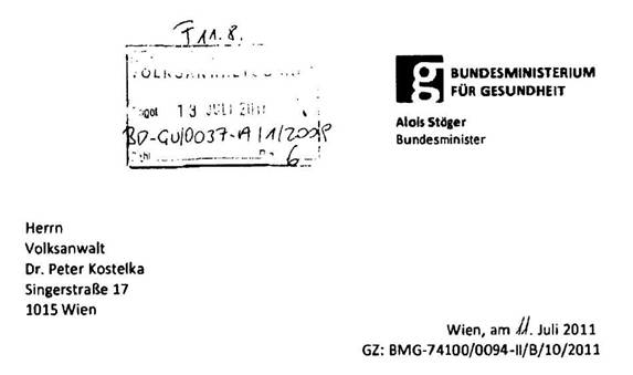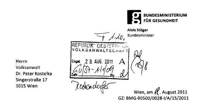 Die Volksanwaltschaft hat vor Kurzem eine Stellungnahme des Bundesministers für Gesundheit erhalten, in dem dieser ausführt[3]: