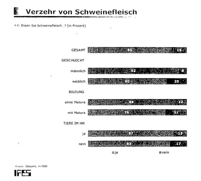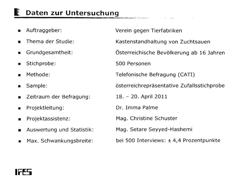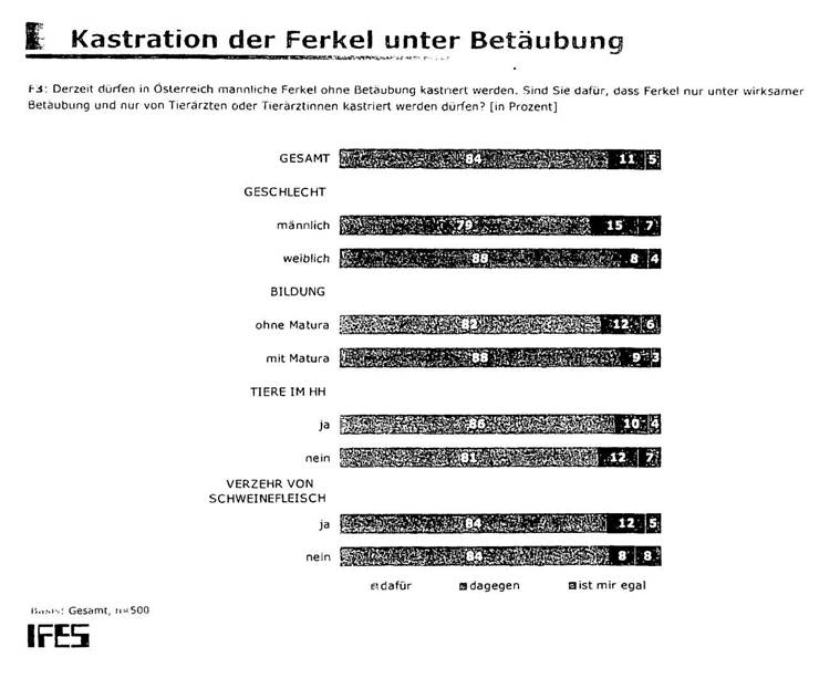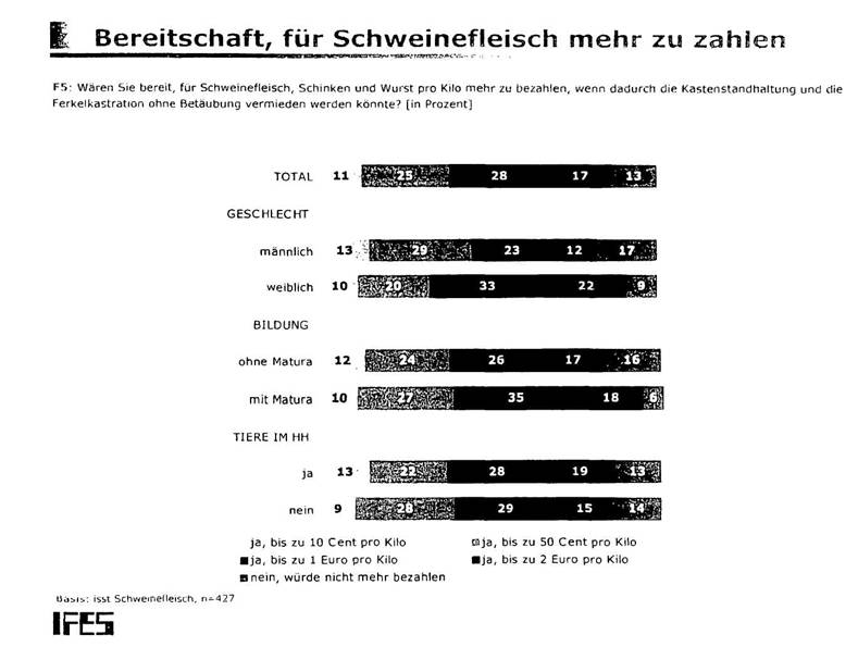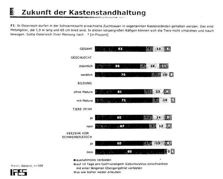 In der Beilage 2 angeschlossen ist eine aktuelle Studie des Instituts für empirische Sozialforschung IFES, der zufolge sich 80 % der österreichischen Bevölkerung für ein Verbot von Kastenständen ausspricht. Gemäß dieser Untersuchung wären Menschen bereit, für tierschutzgerechtere Haltungsformen mehr Geld beim Kauf von Schweinefleisch auszugeben.