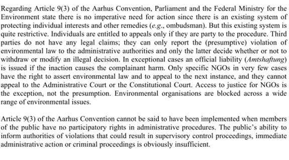 Im April 2012 wurde die Entscheidung des ACCC (ACCC/C/2010-48) angenommen[3]. „Demnach ist Österreich dazu verpflichtet, Umweltorganisationen (UO) in allen Umweltmaterien Rechtsmittelbefugnisse („Verbandsbeschwerde“) im Hinblick auf Handlungen, Entscheidungen und Unterlassungen von Privatpersonen und Behörden einzuräumen, um der Verpflichtung des Art 9 Abs 3 nachzukommen (Rn 81). Während das ACCC zur Kenntnis nimmt, dass es im Rahmen von UVP und IPPC-Verfahren sowie bei der Umwelthaftung Rechtsmittel für UO gibt, wird klargestellt, dass dies in allen anderen Bereichen eben nicht der Fall ist. …Das ACCC stellte jedenfalls klar, dass weder das Zivilrecht noch die Umweltanwaltschaften ausreichen, um Art 9 Abs 3 zu entsprechen. Die Verpflichtung zur Einführung von Rechtsschutz für UO beschränkt sich, wie sich aus dem Wortlaut des Abkommens und der Entscheidung des ACCC ergibt, nicht auf Genehmigungsverfahren, sondern umfasst auch die Prüfung von Plänen und Programmen, die Einhaltung von Bescheidauflagen, UVP-Feststellungsverfahren oder andere Handlungen oder Unterlassungen von Privatpersonen und Behörden, die gegen Umweltrecht verstoßen.“ (Thomas Alge, Aarhus-Entscheidung: Österreich unter Handlungsdruck, Rdu 3/2012).