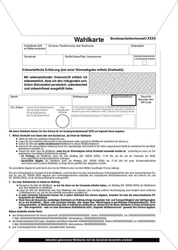 Unmittelbar nach Inkrafttreten der Verordnung wurden im Bundesministerium für Inneres die für die Vorbereitung der Wiederholungswahl erforderlichen Maßnahmen getroffen. Wesentlicher Teil dieser Maßnahmen war die Beschaffung der für die Durchführung der Wahl erforderlichen Drucksorten bei dem durch Rahmenvertrag verpflichteten Druckereiunternehmen. Unter diesen Drucksorten befanden sich auch rund 1,5 Millionen Wahlkarten-Vordrucke, die identisch mit jenen Vordrucken waren, die schon bei den beiden zurückliegenden Wahlgängen zur Bundespräsidentenwahl verwendet worden sind und im Wesentlichen auch technisch identisch mit den Vordrucken von allen bundesweiten Wahlereignissen seit 2010 sind. Im August 2016 wurden die Wahlkarten-Vordrucke durch das beauftragte Druckereiunternehmen im Weg der Bezirkswahlbehörden an die Gemeinden ausgeliefert. Am 5. September 2016 konnte mit der flächendeckenden Ausstellung und Versendung der Wahlkarten begonnen werden.