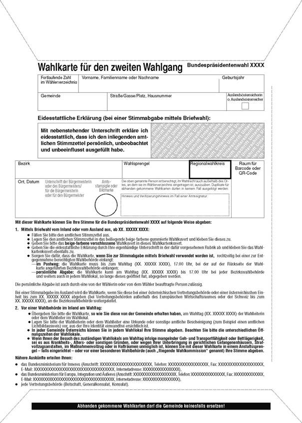 (6) Auf der Anlage 5, Vorderseite, hat anstelle des Wortlautes „mittels Briefwahl vom Inland oder vom Ausland aus, ab XX. XXXXX XXXX“ der Wortlaut „mittels Briefwahl vom Inland oder vom Ausland aus, ab Erhalt der Wahlkarte“ zu treten.“