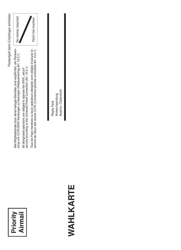 Aufgrund der bei der Nationalratswahl 2013 gemachten Erfahrungen bezüglich der portofreien Übermittlung von Wahlkarten aus dem Ausland wird das Layout der Rückseite der Wahlkarte nach intensiven Beratungen mit der Österreichische Post Aktiengesellschaft neuerlich geändert. Zwar ist es augenscheinlich, dass die Weiterleitung unfrankierter Wahlkarten aus dem Ausland aufgrund der schon bestehenden Hinweise für die ausländischen Postverwaltungen zum überwiegenden Teil klaglos funktioniert hat. Um die Zahl jener seltenen Einzelfälle weiter zu minimieren, in denen eine ausländische Postgeschäftsstelle die portofreie Entgegennahme der Wahlkarte versagt hat, werden in Hinkunft die postalischen Hinweise gemäß dem als Anlage 2, Rückseite, gesetzlich verankerten Vordruck zusätzlich auch auf Deutsch und Französisch abgedruckt (bisher hat die Wahlkarte lediglich einen Hinweis in englischer Sprache enthalten).