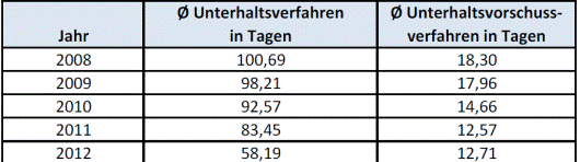 Zur Beantwortung dieser Frage (durchschnittliche Dauer von in den Jahren 2008 bis 2012 jeweils angefallenen Verfahren) wurden die Unterhaltsverfahren und Unterhaltsvorschussverfahren der Jahre 2008 bis 2012 ausgewertet.