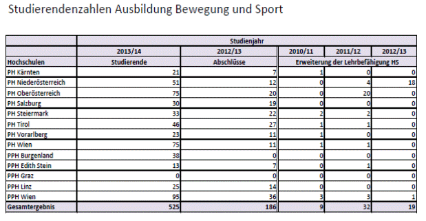 Die lehrplanmäßigen Voraussetzungen des Pflichtgegenstandes „Bewegung und Sport“ in Entsprechung der einschlägigen im Bundesgesetzblatt kundgemachten Verordnungen haben sich in den letzten Jahren nur hinsichtlich der Neuen Mittelschule geändert (BGBl. II Nr. 185/2012). Die lehrplanmäßigen Voraussetzungen lassen sich hinsichtlich des Pflichtgegenstandes „Bewegung und Sport“ skizzieren zB. für die Volksschule: 3-3-2-2 Wochenstunden (1. bis 4. Schulstufe), für die Hauptschule: 12-18 Wochenstunden (Ermächtigung für schulautonome Lehrplanbestimmungen für die 1. bis 4. Klasse) bzw. 4-3-3-3 Wochenstunden (für die 1. bis 4. Klasse, soweit keine schulautonomen Lehrplanbestimmungen bestehen), für die Neue Mittelschule 10-19 Wochenstunden (Ermächtigung für schulautonome Lehrplanbestimmungen für die 1. bis 4. Klasse) bzw. 4-3-3-3 Wochenstunden (für die 1. bis 4. Klasse, soweit keine schulautonomen Lehrplanbestimmungen bestehen, bei Führung eines Schwerpunktes, der dem sprachlichen, humanistischen und geisteswissenschaftlichen Schwerpunktbereich oder der dem naturwissenschaftlichen und mathematischen Schwerpunktbereich oder der dem musisch-kreativen Schwerpunktbereich zuzuordnen ist) bzw. 4-3-3-4 Wochenstunden (für die 1. bis 4. Klasse, soweit keine schulautonomen Lehrplanbestimmungen bestehen, bei Führung eines Schwerpunktes, der dem ökonomischen und lebenskundlichen einschließlich praxisbezogenen Schwerpunktbereich zuzuordnen ist oder ohne Führung eines Schwerpunktes), für die AHS-Unterstufe: 13-19 Wochenstunden (Ermächtigung für schulautonome Lehrplanbestimmungen für die 1. bis 4. Klasse Gymnasium, Realgymnasium oder wirtschaftskundliches Realgymnasium) bzw. 4-4-3-3 Wochenstunden (für die 1. bis 4. Klasse Gymnasium, Realgymnasium oder wirtschaftskundliches Realgymnasium, soweit keine schulautonomen Lehrplanbestimmungen bestehen), für die AHS-Oberstufe: mindestens 8 Wochenstunden (Ermächtigung für schulautonome Lehrplanbestimmungen für die 5. bis 8. Klasse Gymnasium, Realgymnasium oder wirtschaftskundliches Realgymnasium, wobei mindestens 2 Wochenstunden pro Klasse vorzusehen sind) bzw. 3-2-2-2 Wochenstunden (für die 5. bis 8. Klasse Gymnasium, Realgymnasium oder wirtschaftskundliches Realgymnasium, soweit keine schulautonomen Lehrplanbestimmungen bestehen). An den Polytechnischen Schulen sind 1-3 Wochenstunden (Ermächtigung für schulautonome Lehrplanbestimmungen) bzw. 2 Wochenstunden (soweit keine schulautonomen Lehrplanbestimmungen bestehen) „Bewegung und Sport“, an den Allgemeinen Sonderschulen sind in der 1. bis 8. Schulstufe jeweils 3 Wochenstunden, vorgesehen.