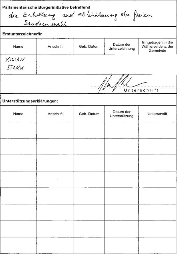 Formblatt für eine Parlamentarische Bürgerinitiative