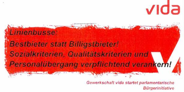 Um diese Fehlentwicklung zu stoppen, startet die Gewerkschaft vida eine parlamentarische Bürgerinitiative. Damit fordern wir den Nationalrat auf, im Bundesvergabegesetz sicherzustellen, dass bei Ausschreibungen von Busleistungen das Bestbieterprinzip angewendet wird. Zusätzlich fordern wir, dass der vom Bundesministerium für Verkehr, Innovation und Technologie (BMVIT) veröffentlichte Leitfaden zu Qualitäts- und Sozialstandards bei Busausschreibungen verpflichtend zur Anwendung kommt. Damit soll der Best- und nicht der Billigstbieter zum Zug kommen, denn: Qualität hat ihren Preis! Weiters soll festgelegt werden, dass bei einem Betreiberwechsel die bisher auf diesem Streckenlos Beschäftigten zu ihren aktuellen Arbeits- und Entlohnungsbedingungen, vom neuen Unternehmen übernommen werden müssen. Es muss aber die Entscheidungsfreiheit der Beschäftigten sein, ob sie dieses Angebot zum Wechsel annehmen wollen oder nicht.