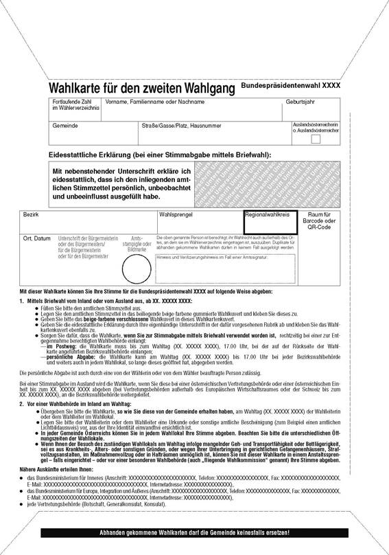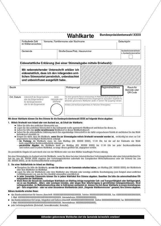 (6) Auf der Anlage 5, Vorderseite, hat anstelle des Wortlautes „mittels Briefwahl vom Inland oder vom Ausland aus, ab XX. XXXXX XXXX“ der Wortlaut „mittels Briefwahl vom Inland oder vom Ausland aus, ab Erhalt der Wahlkarte“ zu treten.