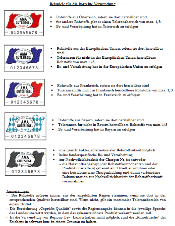 „In der AMA-Gütesiegel Richtlinie für Be- und Verarbeitungsprodukte ist unter http://www.ama-marketing.at/home/groups/16/AMA_Guetesiegel_Richtlinie_Be_und_Verarbeitungsprodukte_010913_final.pdf detailliert nachzulesen, unter welchen Voraussetzungen ein AMA-Gütesiegel verliehen werden darf.