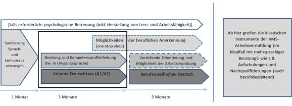 Das vorgeschlagene Maßnahmenpaket dauert sieben Monate und umfasst eine Sprachaufbau- und Berufsorientierungsphase. Eine wesentliche Voraussetzung für eine erfolgreiche Integration am Arbeitsmarkt sind Sprachkenntnisse, auch berufs- bzw. branchenspezifische. Dieser Sprachkursphase folgt, um eine erfolgreiche berufliche Integration zu gewährleisten, eine berufliche Orientierungsphase. Deren Ziel ist es auch, die mitgebrachten formellen und informellen Qualifikationen und Kompetenzen zu erheben und verwertbar zu machen. Um dieser Zielsetzung nachzukommen, gehört die Anerkennung international erworbener beruflicher Qualifikationen erleichtert und durch ein one-stop-shop Verfahren abgewickelt. Denn die systematische Nicht-Anerkennung und Vernachlässigung von international erworbenen Berufsqualifikationen und Arbeitspraxis kommen einer Dequalifizierung gleich und können als eine Sonderform des Lohndumpings betrachtet werden.