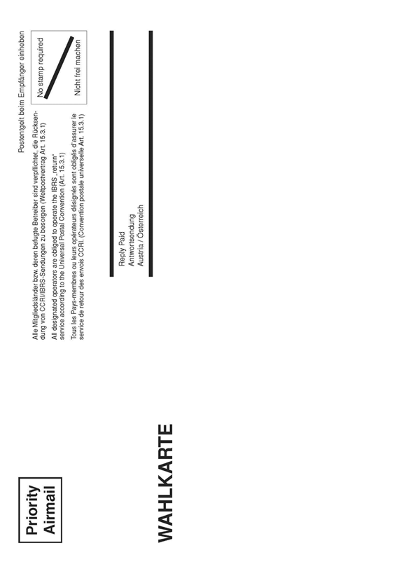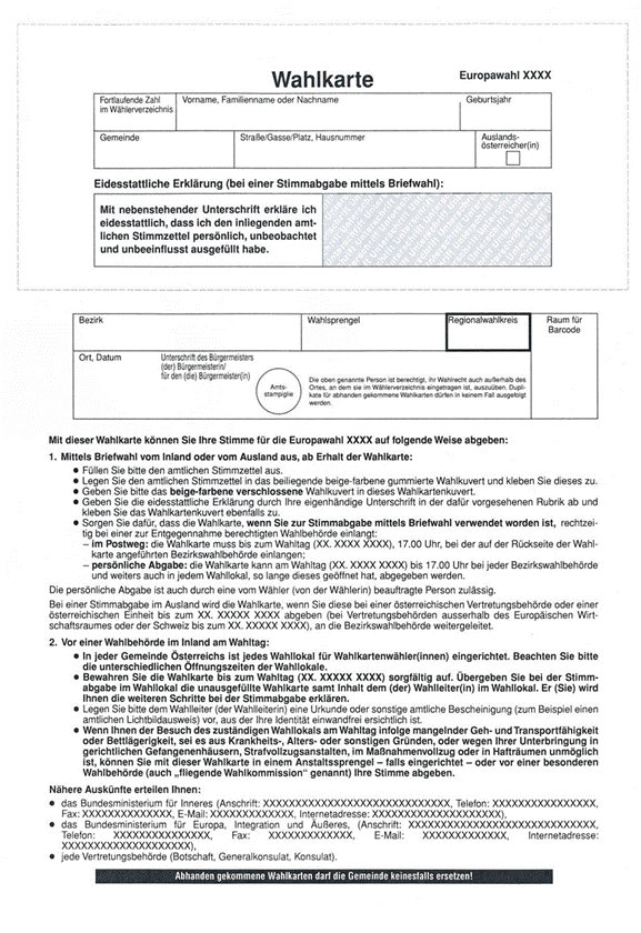 (2) Hierzu hat der Wähler den von ihm ausgefüllten amtlichen Stimmzettel in das beigefarbene Wahlkuvert zu legen, dieses zu verschließen und in die Wahlkarte zu legen. Sodann hat er auf der Wahlkarte durch eigenhändige Unterschrift eidesstattlich zu erklären, dass er den amtlichen Stimmzettel persönlich, unbeobachtet und unbeeinflusst ausgefüllt hat. Anschließend hat er die Wahlkarte zu verschließen. Die Wahlkarte ist entweder im Postweg so rechtzeitig an die zuständige Bezirkswahlbehörde zu übermitteln, dass die Wahlkarte dort spätestens am Wahltag, 17.00 Uhr, einlangt, oder am Wahltag in einem Wahllokal während der Öffnungszeiten oder bei einer Bezirkswahlbehörde bis 17.00 Uhr abzugeben. Eine Abgabe durch einen Überbringer ist zulässig. Wahlkarten, die bei einer Stimmabgabe im Ausland bei einer österreichischen Vertretungsbehörde oder einer österreichischen Einheit bis zum sechsten Tag vor dem Wahltag, bei einer Vertretungsbehörde außerhalb des Europäischen Wirtschaftsraums oder außerhalb der Schweiz bis zum neunten Tag vor dem Wahltag, einlangen, sind von der Vertretungsbehörde oder der österreichischen Einheit an die zuständige Bezirkswahlbehörde weiterzuleiten. Die Weiterleitung einer nach dem sechsten Tag vor dem Wahltag, in Vertretungsbehörden außerhalb des Europäischen Wirtschaftsraums oder außerhalb der Schweiz nach dem neunten Tag vor dem Wahltag, einlangenden Wahlkarte durch eine österreichische Vertretungsbehörde oder eine österreichische Einheit an die zuständige Bezirkswahlbehörde ist zulässig, wenn gewährleistet erscheint, dass die Wahlkarte dennoch rechtzeitig bei der zuständigen Bezirkswahlbehörde einlangen kann, oder der Wahlberechtigte in Kenntnis gesetzt wird, dass ein Einlangen möglicherweise nicht mehr rechtzeitig gewährleistet ist. Die Kosten für eine Übermittlung der Wahlkarte an die Bezirkswahlbehörde im Postweg hat der Bund zu tragen.
