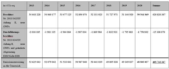Durch eine Änderung der Abgrenzung der Sektoren, die unter das EHS fallen, wurde ein Durchführungsbeschluss der Europäischen Kommission notwendig, der eine Anpassung der verpflichtend einzuhaltenden Emissionszuweisung vornahm. Nach Abzug dieser zusätzlichen Emissionen im Emissionshandelssystem von 1 758 832 t CO2-eq für 2020, der im Durchführungsbeschluss Nr. 2013/634/EU in Anhang II festgehalten ist, ergibt sich die für Österreich verpflichtend einzuhaltende Emissionszuweisung von 48 803 037 t CO2-eq für 2020.
