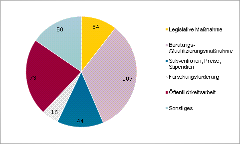 Gegenstand dieses Berichts sind nur jene Maßnahmen, die seitens der Ministerien und des Bundeskanzleramtes im Zeitraum 2013 und 2014 nach außen gesetzt wurden - so genannte „externe“ Maßnahmen“. Maßnahmen zur internen Frauenförderung sind nicht Gegenstand des Berichtes. Außerdem wurden in den vorliegenden Bericht nur jene Maßnahmen aufgenommen, die während des Erhebungszeitraums initiiert oder weitergeführt wurden und die sich explizit an Frauen richten. Die Tragweite der berichteten Maßnahmen ist jedoch sehr unterschiedlich und reicht von der Veröffentlichung von Berichten, über Gesetzesänderungen bis zu mehrjährigen Förderungsprogrammen.