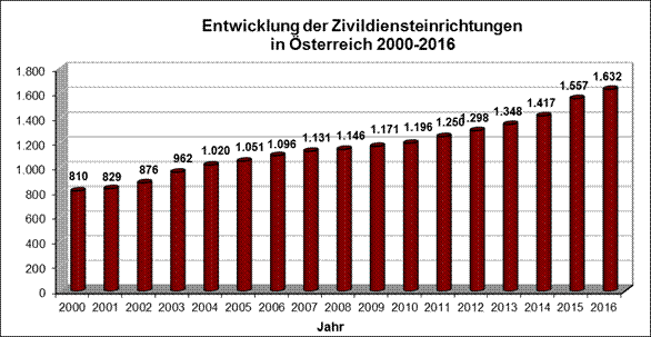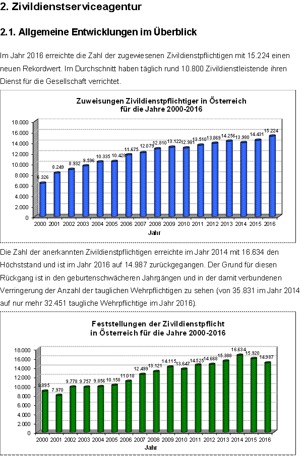 Noch nie gab es so viele Zivildiensteinrichtungen, noch nie war deren Bedarf an Zivildienstleistenden so hoch und noch nie wurden so viele Zivildienstleistende zugewiesen wie im eben abgelaufenen Jahr. Dazu kommt, dass immer mehr junge Männer von der Möglichkeit Gebrauch machen, ein Freiwilliges Sozialjahr, Freiwilliges Umweltschutzjahr oder einen Gedenkdienst, Friedens- oder Sozialdienst im Ausland absolvieren und damit zur Leistung des ordentlichen Zivildienstes nicht mehr heranzuziehen sind.