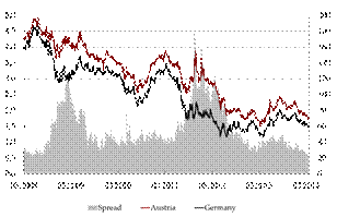Neben den budgetären und wirtschaftlichen Gegebenheiten spielte auch die US-Geldpolitik eine wichtige Rolle bei der Entwicklung der langfristigen Zinsen in den letzten 12 Monaten. Ab Juni 2013 kam zu einem deutlicheren Anstieg der langfristigen Zinsen in vielen Industriestaaten, welcher durch die Ankündigung der US-Notenbank über eine Verringerung der US-Anleihekäufe ausgelöst wurde. Nachdem sich die langfristigen österreichischen Zinsen (10jährige Rendite für Staatsanleihen) von etwa 1,5% im Frühjahr 2013 auf etwa 2,5% bis September 2013 erhöht hatten, haben sich die langfristigen Zinsen seither wieder abgeschwächt. Der Spread der 10jährigen österreichischen Rendite zur 10jährigen deutschen Rendite zeigt seit Herbst 2013 relativ geringe Schwankungen.