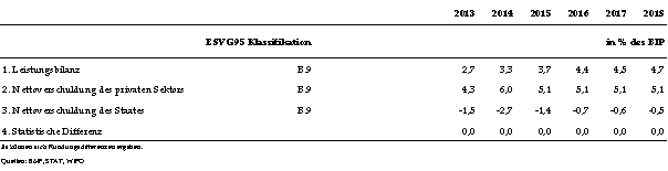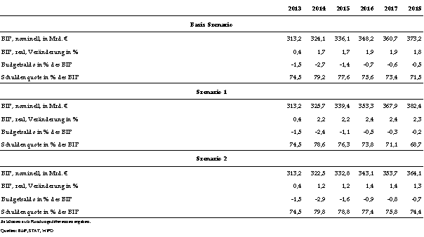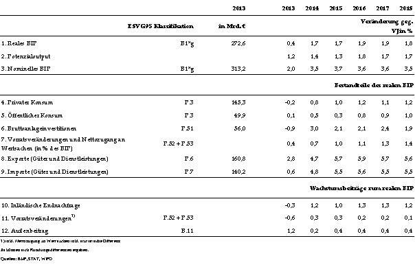Der Wegfall von wachstumsdämpfenden Faktoren, Nachholeffekte und ein günstiges internationales Umfeld werden sich positiv auf die Investitionen auswirken, auch wird ein Ansteigen der Nettoexporte erwartet. Vor dem Hintergrund einer Ausweitung der Beschäftigung und wiedererstarkender Gewinneinkommen sollte sich auch der private Konsum beschleunigen. Ein Teil der Impulse, die darüber hinaus von einer besseren Entwicklung der Lohn- und Selbständigeneinkommen kommen werden, dürfte jedoch zu vermehrter Ersparnisbildung genutzt werden, sodass sich die Sparquote schrittweise auf über 8½% im Jahr 2018 erhöhen wird. Die Budgetkonsolidierungsbemühungen werden insbesondere bis 2016 zu einer moderaten öffentlichen Nachfrage beitragen.