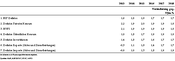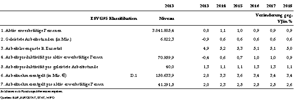 Nach Durchschreiten der Talsohle im vergangenen Jahr dürfte der aktuelle Konjunkturaufschwung weniger dynamisch als in den Konjunkturzyklen davor ausfallen, die Wachstumsspitze wird im Jahr 2016 mit einem realen Wirtschaftswachstum von +1,9% überschritten werden. Für das Ende des Projektionszeitraumes im Jahr 2018 wird mit einem realen Wachstum von +1,8% und einer zu diesem Zeitpunkt mit -0,2% des Potentialoutputs noch nicht vollkommen geschlossenen Outputlücke gerechnet. Lag das durchschnittliche reale Wachstum von 2008 bis 2013 bei nur +0,6% pro Jahr, so sollte es sich im Zeitraum von 2014 bis 2018 auf +1,8% pro Jahr beschleunigen.