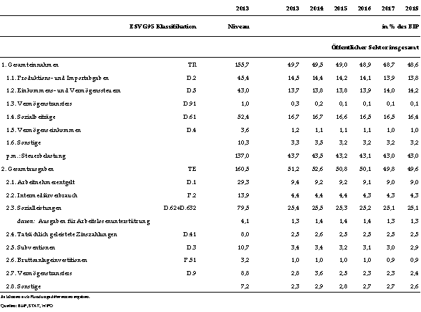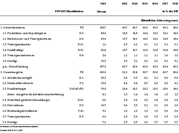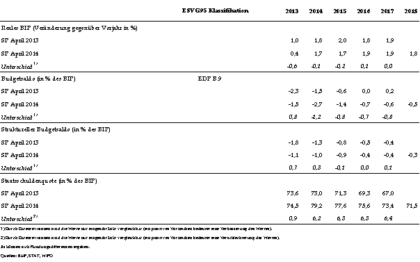 Das vorliegende Programm sowie die vorliegende Übersicht basieren auf dem Bundesfinanzrahmengesetz 2015-2018 (BFRG) und den Eckwerten des österreichischen Stabilitätspakts (ÖStP), den Daten der Volkswirtschaftlichen Gesamtrechnung der Statistik Austria (STAT) bis 2013, der Konjunkturprognose des Österreichischen Instituts für Wirtschaftsforschung (WIFO) vom 27. März 2014 sowie eigenen Berechnungen und Einschätzungen des Bundesministeriums für Finanzen (BMF).