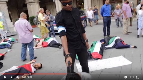 9. Bei dem Bild aus dem Jahr 2014, das eine Scheinexekution eines Palästinensers durch einen Israeli zeigen soll, ist ein Polizeiwagen zu sehen. War die Aktion im Jahr 2014 angemeldet?