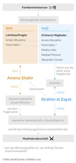 Eine weitere Verbindung ist die Adresse im 23. Wiener Gemeindebezirk, an der die MJÖ angesiedelt ist. Das Haus gehört der Anas-Shakfeh-Stiftung, die nach dem ehemaligen Präsidenten der Islamischen Glaubensgemeinschaft in Österreich (IGGiÖ) benannt wurde. An derselben Adresse ist auch die IRPA gemeldet. Die IRPA ist ein privater Studiengang für das Lehramt für Islamische Religion an Pflichtschulen in Wien. Die IRPA Leiterin ist Amena Shakir. Shakir ist in Österreich für die Ausbildung von Religionslehrern zuständig und war davor in Deutschland für eine Deutsch-Islamische Schule in München zuständig. Diese wurde 2005 von der ober-bayerischen Regierung geschlossen, weil sie eine Nähe zur IGD aufwies. IGD ist die Islamische Gemeinschaft in Deutschland und wird als der deutsche Zweig der ägyptischen Muslimbruderschaft gesehen. Präsident der IGD war der bereits erwähnte Ibrahim el-Zayat – der Bruder von Amena Shakir.[3]