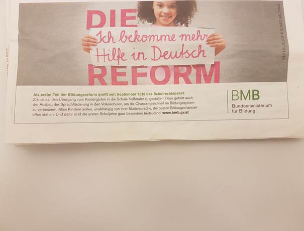 betreffend „DIE (Ich bekomme mehr Hilfe in Deutsch) REFORM“ – Inserat des BMB in „Heute“ vom 16.11.2016