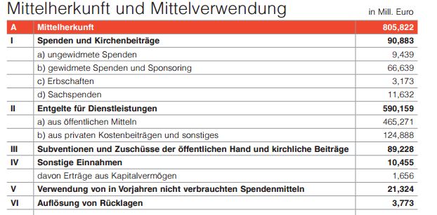 Man kann anhand der Abbildung erkennen, dass die Caritas 465,271 Mio. € für staatliche Dienstleistungen, aber auch 89,228 Mio. € Subventionen und Zuschüsse von Kirche und Staat, erhalten hat.