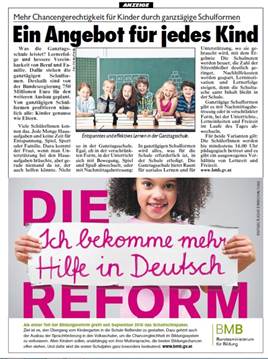 In der „Krone“ vom 16. November 2016 ist auf Seite 35 ein Inserat des BMB mit dem Titel „Reform“ zu finden.