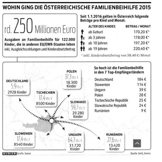 Die Familienbeihilfe für im Ausland lebende Kinder ist derzeit ein großes Thema. Einige der veröffentlichten Zahlen sind nicht nachvollziehbar. Laut Berichterstattung im Kurier vom 16.12. 2016 wurden für 2015 rund 250 Millionen Euro Ausgaben an Familienbeihilfe für rund 122.000 Kinder im Ausland lebende Kinder ausbezahlt.'