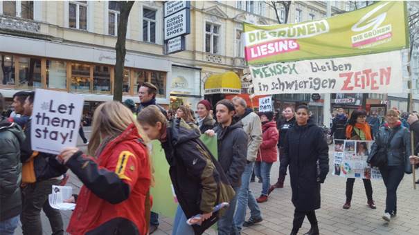 Am 26. 11. 2016 fand auf der Wiener Mariahilferstraße eine Demonstration für Asylrecht bzw. „Die Demonstration gegen Abschiebung“[1] mit dem Titel „Let them stay“ statt. An der Demonstration nahmen rund 1300 Personen teil. Unter den Teilnehmern waren – wie auf den gehissten Transparenten ersichtlich - Die Grünen (im Bild unten zB Faika El Nagashy, Gemeinderätin in Wien). Weitere Teilnehmer waren Mitglieder der irakischen und der ägyptischen Gemeinden, welche später zudem an Auseinandersetzungen beteiligt waren.