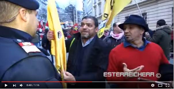 Foto: Screenshot, Ibrahim Ali, Sprecher der Ägyptischen Gemeinde bei der Demonstration in erregtem Gespräch mit einem Exekutivbeamten. Mit Flagge und Sackerl der „Grünen“.[6]