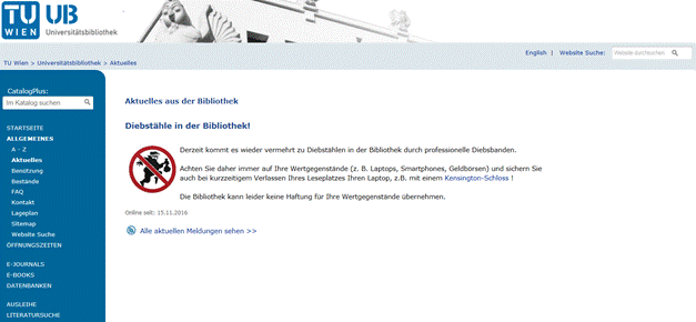 Auf der Webseite der Bibliothek der Technischen Universität Wien http://ub.tuwien.ac.at/ ist unter der Rubrik „Allgemeines“, Unterrubrik „Aktuelles“ folgende Warnmeldung zu lesen: