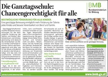 In „Österreich“ vom 23. Dezember 2016 ist auf Seite 21 ein Inserat des BMB mit dem Titel „Ganztagsschule“ zu finden.