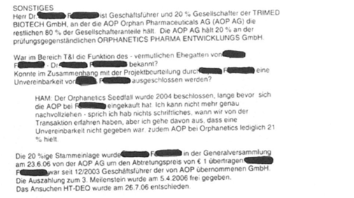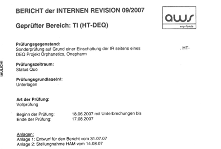 Der in den Fragen zitierte Text stammt aus dem Dokument: Bericht der internen Revision 97/2007. Prüfgegenstand: Sonderprüfung aufgrund einer Einschaltung der IR seitens eines DEQ Projekt Orphanetics, Onepharm. Art der Prüfung: Vollprüfung; Prüfungszeitraum: 18.06.2007 mit Unterbrechungen bis 17.08.2007.