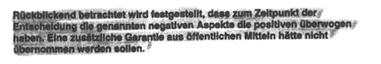 3. Ist es korrekt, dass der Bericht der internen Revision, wie unten angeführt, folgendes festhält: "Rückblickend betrachtet wird festgestellt, dass zum Zeitpunkt der Entscheidung die genannten negativen Aspekte die positiven überwogen haben. Eine zusätzliche Garantie aus öffentlichen Mitteln hätte nicht übernommen werden sollen." (Bitte mit Ja oder Nein Antworten)
