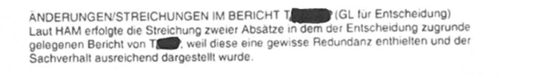 b. Wurde in diesem Zusammenhang folgendes festgehalten: „Die diesbezüglichen klaren Ausführungen im Bericht L. (...) scheinen in dem von F. überarbeiteten Bericht noch auf, fehlen aber in späteren Berichten."