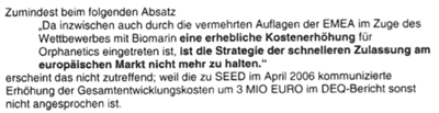a. Wurde in diesem Zusammenhang auch dargelegt, dass es sich um keine Redundanz gehandelt hat, sondern um Textpassagen wie "Da inzwischen auch durch die vermehrten Auflagen der EMEA im Zuge des Wettbewerbes mit Biomarin eine erhebliche Kostenerhöhung für Orphanetics ist, ist die Strategie der schnelleren Zulassung am europäischen Markt nicht mehr zu halten." gestrichen wurden?