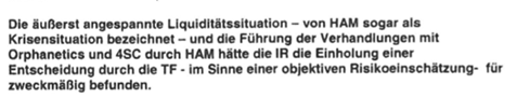 b. Ist es in diesem Zusammenhang auch korrekt, dass die interne Revision dazu folgendes angemerkt hat: "Die äußerst angespannte Liquiditätssituation – von Hammerschmid sogar als Krisensituation bezeichnet – und die Führung der Verhandlungen mit Orphanetics und 4SC durch Hammerschmid hätte die IR die Einholung einer Entscheidung durch die Task Force – im Sinne einer objektiven Risikoeinschätzung- für zweckmäßig befunden.“?
