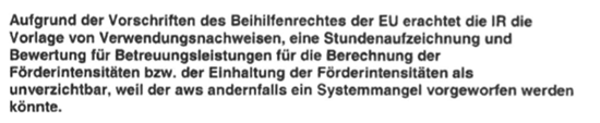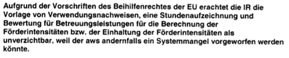 8. Ist es korrekt, dass der Bericht der internen Revision, wie unten angeführt, folgendes festhält: "Aufgrund der Vorschriften des Beihilfenrechtes der EU erachtet die IR die Vorlage von Verwendungsnachweisen, eine Stundenaufzeichnung und Bewertung für Betreuungsleistungen für die Berechnung der Förderintensitäten bzw. der Einhaltung der Förderintensitäten als unverzichtbar, weil der AWS andernfalls ein Systemmangel vorgeworfen werden könnte."?