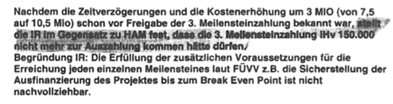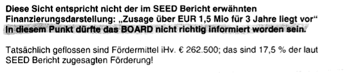 Bei der Förderung der Unternehmen, orientiert man sich an Milestones, welche wiederum mit den Förderungen der Forschungsförderungsgesellschaft (FFG) bzw. dem Forschungsförderungfonds (FFF) zusammen hängen. Jedoch war es so, dass die FFG bereits die zweite und die dritte Teilzahlung verweigerten. Durch den Bericht entsteht der Verdachstmoment, dass diese ausbleibenden Zahlungen durch Zahlungen des AWS ersetzt wurden. Konkret wird im Bericht der internen Revision dass im SEED Bericht, welcher dem Board vorgelegt wurde, folgende Finanzierungsdarstellung beschrieben: „Zusage über EUR 1,5 Mio für 3 Jahre liegt vor.“ Tatsächlich, so stellt es der Bericht klar, sind es Fördermittel iHv. EUR 262.500, also nur 17,5% der laut SEED Bericht zugesagten Förderung. Das Board wurde also nicht richtig informiert. Während also die Mittel aus anderen Quellen, welche sich ebenfalls an den Milestones orientieren, nicht ausgezahlt wurden, wurden vom AWS alle Auszahlungen genehmigt.