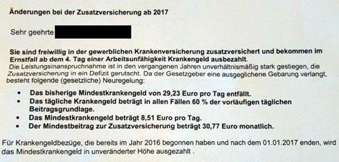 Per Jänner 2017 erhielten jene Versicherten, die diese Zusatzversicherung in Anspruch nehmen, folgenden Brief: