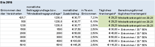 Das heißt: Auch wenn man 426,- verdient, kostet die Zusatzkrankenversicherung 30,77.- (entspricht 7,23% des tatsächlichen Einkommens anstatt der eigentlich verankerten 2,5 Prozent, da die „Mindestbeitragsgrundlage“ rechnerisch 1.230,80.- beträgt).
