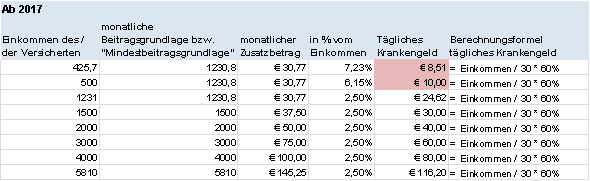 Anmerkung allgemein: Die Werte beziehen sich grundlegend auf 2017. Ausnahme: Das tägliche Krankengeld;