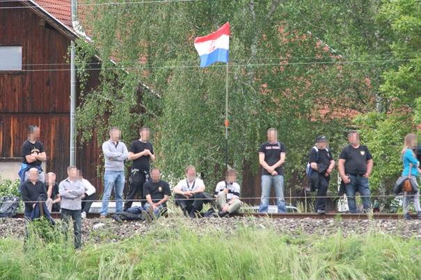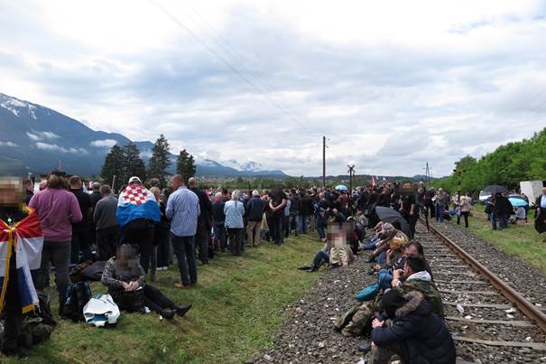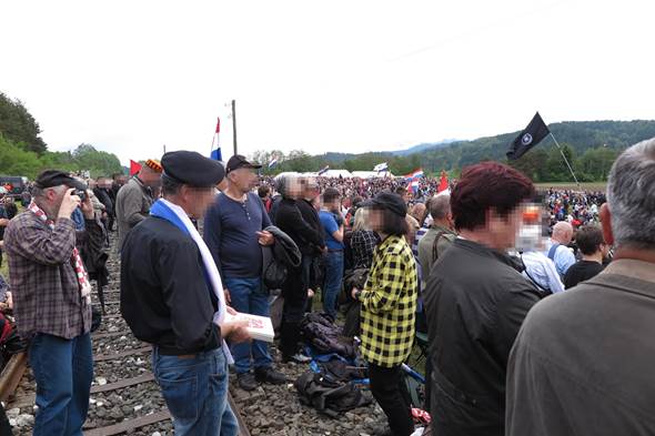 Teilnehmer der Feier nehmen auf dem Gleiskörper sitzend und stehend an der Feier teil und hissen dort eine Fahne mit dem Symbol des faschistischen Ustaša-Staats (NDH-Staat, Schachbrettmuster mit weißem Feld beginnend)