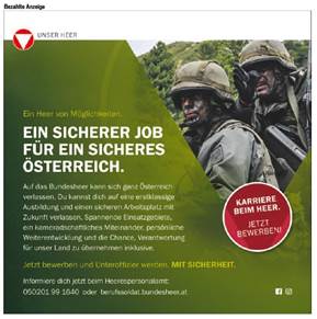 In „Österreich“ vom 23. Februar 2017 ist auf Seite 27 ein Inserat des BMLVS mit dem Titel „Heer von Möglichkeiten“ zu finden.