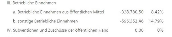 Lt. Abbildung hat die Organisation zwar weder Subventionen noch Zuschüsse aus öffentlicher Hand erhalten hat, jedoch werden betriebliche Einnahmen aus öffentlichen Mitteln in Höhe von €338.780,50 ausgewiesen.