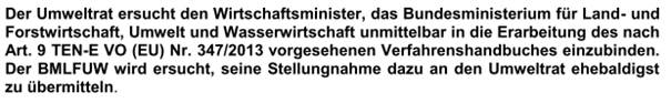 Da Vorhaben von gemeinsamem Interesse großteils UVP-pflichtig sind bzw sein werden, befasste sich der Umweltrat auf Verlangen der Anfragestellerin in seiner Sitzung am 21. Jänner 2014 mit dem Verhältnis von UVP-G und TEN-Energie-VO. Er fasste einstimmig (mit einer Enthaltung) folgende Empfehlung: