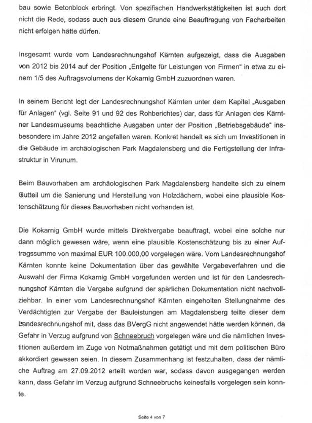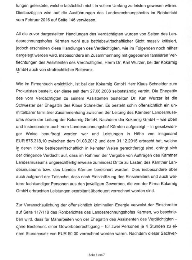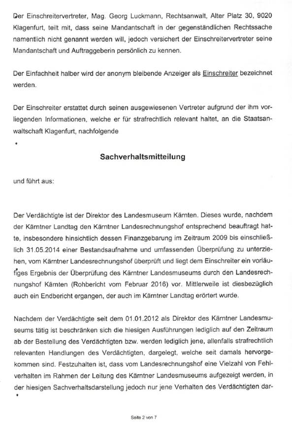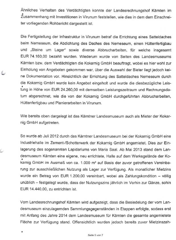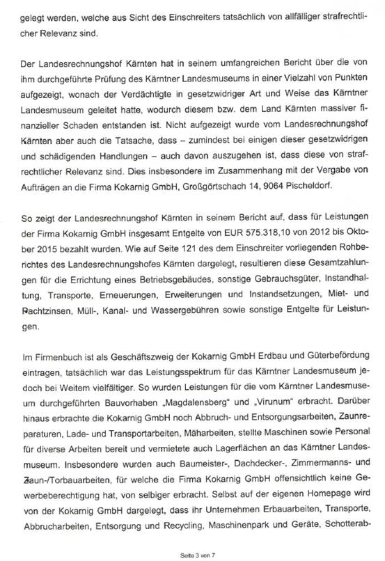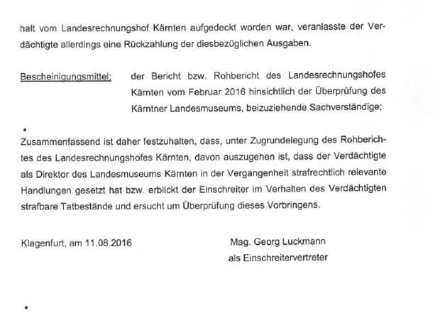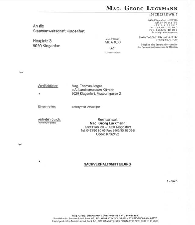 Auf Grundlage des Rohberichtes des Landesrechnungshofes Kärnten vom Februar 2016 wurde der (damalige) Direktor des Landesmuseums Kärnten, Mag. Thomas Jerger, bei der Staatsanwaltschaft Klagenfurt angezeigt. In der Sachverhaltsmitteilung wurde festgehalten, „dass, unter Zugrundelegung des Rohberichtes des Landesrechnungshofes Kärnten, davon auszugehen ist, dass der Verdächtige als Direktor des Landesmuseums Kärnten in der Vergangenheit strafrechtlich relevante Handlungen gesetzt hat.“