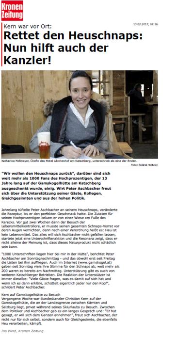 Zudem wurden parlamentarische Anfragen gestellt (11965/J, 11952/J), um den Hintergrund für das Heuverbot offen zu legen. Seitens des betroffenes Wirtes der Gamskogelhütte wurde ebenso eine Online-Petition gestartet, um den Heuschnaps zu erhalten. Medienberichten zufolge hat auch Bundeskanzler Christian Kern den Heuschnapsbefürwortern seine Unterstützung zugesagt und versprochen, sich dieser Sache anzunehmen (siehe Anhang).
