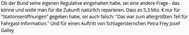 Obwohl es keine rechtliche Basis gibt, wurden seit 1986 Kosten für den U-Bahn-Ausbau in Wien zu 50% seitens des Bundes getragen. Eine Kontrolle zur Mittelver-wendung fand seitdem jedoch nicht statt, sondern das BMF bezog sich in der Regel auf eine „Überprüfung der vom Land Wien bzw. den Wiener Linien übermittelten Investitionspläne bzw. Rechnungsabschlüsse“ (RH-Bericht 2017/1: S. 57). Weder BMF noch BMVIT kontrollierten Buchungen, die nicht direkt mit Investitionen für die U-Bahn im Zusammenhang standen. Laut Rechnungshofbericht gab es bis 2007 keinerlei Vereinbarungen zwischen dem Bund und dem Land Wien über die Vorgehensweise für die Kontrolle der Vertragspartner über die verwendeten Mittel. Erst 2013 wurde eine Vertiefung des Mittelverwendungscontrollings beschlossen, sämtliche Buchungen zuvor wurden ohne detaillierte Regelung über Kostentragung und Mittelverwendungskontrolle getätigt. Aufgrund des Fehlens einer geeigneten Kontrollinstanz konnten seitens der Wiener Linien Zahlungen getätigt werden, die laut Rechnungshof in keiner Weise aus dem gemeinsamen Budget des Bundes und des Landes Wiens hätten finanziert werden dürfen. Dazu zählen unter anderem die Eröffnungsfeiern für die Stationen Seestadt (2013), Aspernstraße (2010) und Stadion (2008). In Summe waren dies bereits 5,34 Mio. EUR, die zur Hälfte der Bund zahlte und eigentlich für den Neubau von U-Bahnen gedacht waren. Eine ähnliche Vorgehensweise wurde seitens der Wiener Linien auch bei der Errichtung des „Verkehrsmuseums“ gewählt.