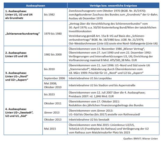 U3 und U6 wurden im Zeitraum 1982 bis 2000 ausgebaut, eine 3. Phase begann im September 2006 mit der Inbetriebnahme der U1 bis Leopoldau und endete im Oktober 2010 mit der Öffnung der U2 bis Stadion und bis Aspernstraße. 2007 wurde ein weiteres Übereinkommen über eine 4. Ausbauphase im Umfang von 1,846 Mrd. EUR getroffen, in dem die Erweiterung der Linien U2 und U1 festgelegt wurde (vgl. RH-Bericht 2017/1. S. 17).